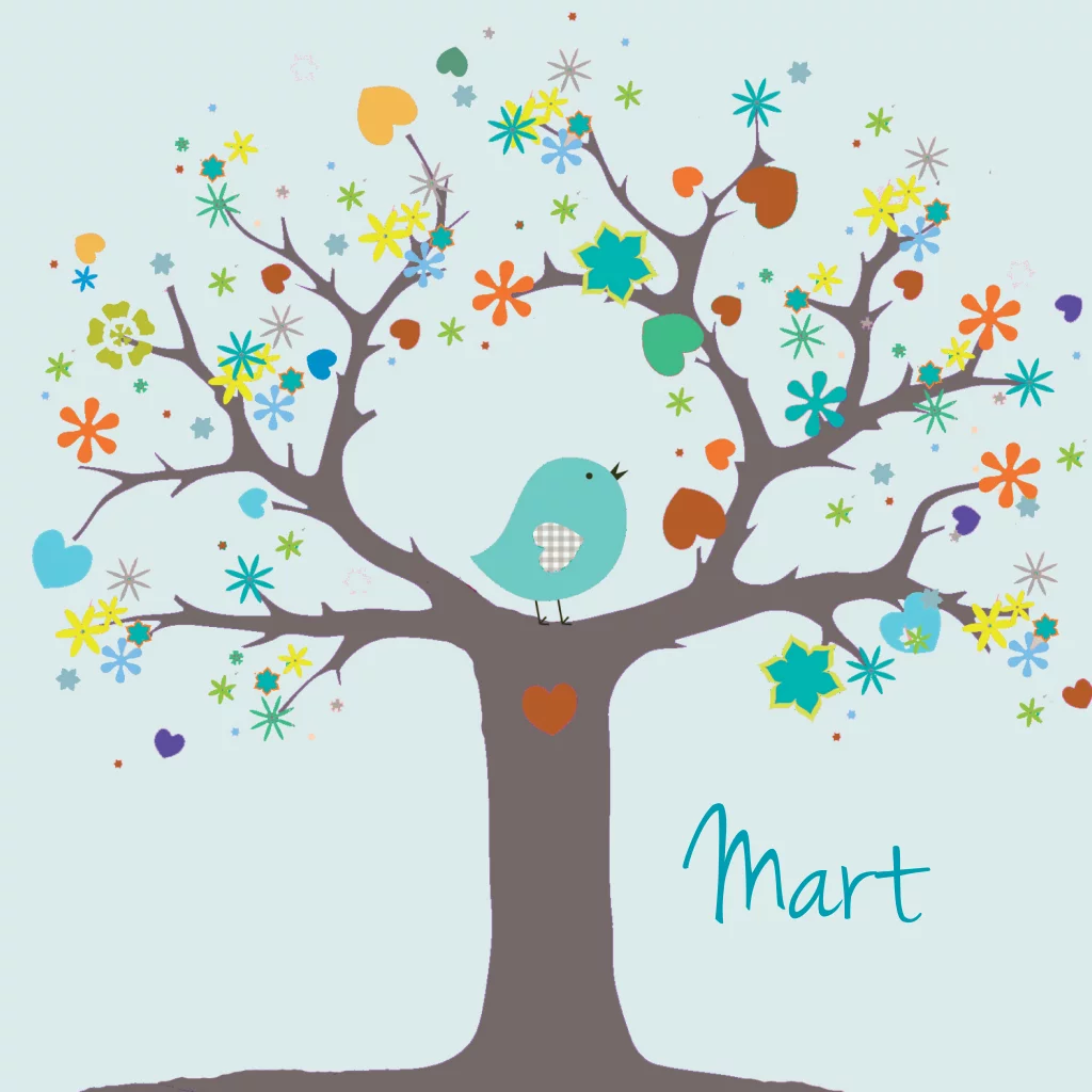 Lief babykaartje met een zingende vogel in een boom van hartjes en bloemetjes. Speciaal voor de geboorte van een zoon.