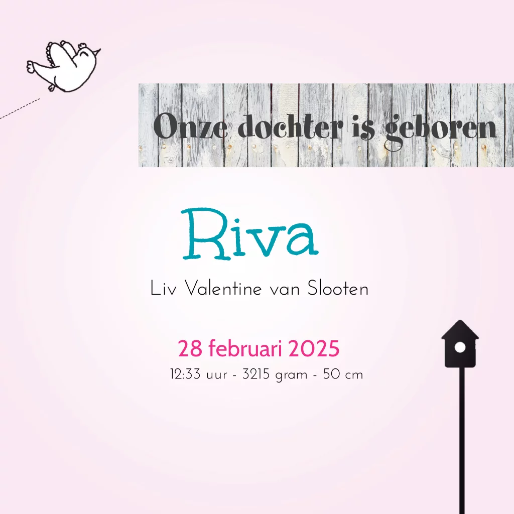 Fleurig kaartje voor een dochter met een houten label waar de naam van je baby in kan staan. Een kaartje met getekende details.