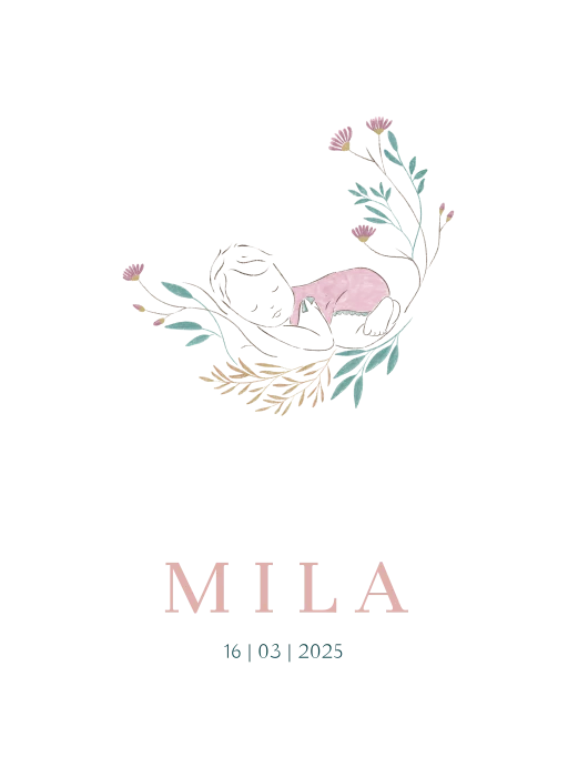 Een toffe canvaspas poster met houten latjes. De poster heeft pastelkleuren en een illustratie van een baby tussen de bloemen. Pas de poster naar wens zelf aan.