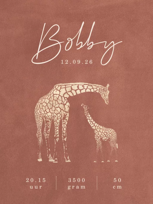 Een toffe canvas poster met houten latjes passend bij het geboortekaartje van jouw kindje. De poster heeft een roestkleur velvet-look achtergrond. Daarnaast zie je twee giraffen en de geboortegegevens van jouw kindje. Pas het ontwerp naar wens aan in onze online editor.