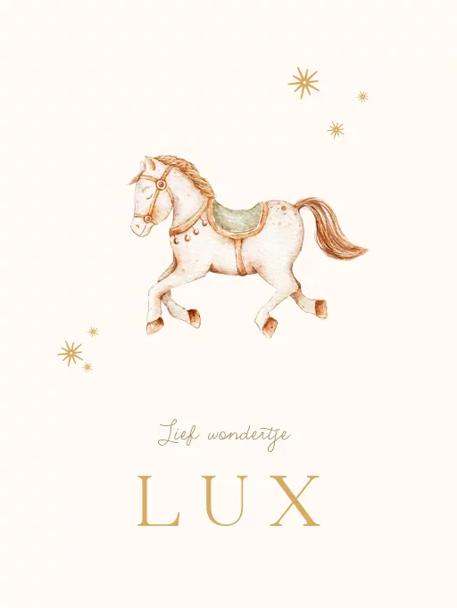 Een lieve canvasposter voor op het kinderkamertje. De poster heeft een lichte achtergrond met daarop een illustratie van een paardje. Daarnaast zie je verschillende sterren. Pas het ontwerp naar wens zelf aan.