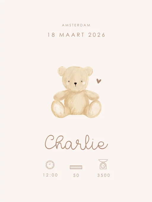 Een schattige canvas poster met beertje. Op de poster zie je de geboortegegevens van jouw kleintje. Pas de poster naar wens aan in onze online editor.