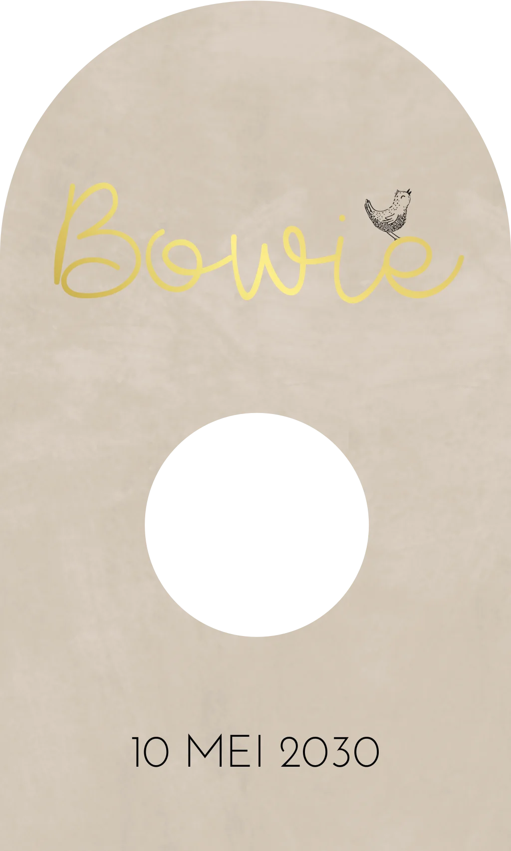 Dit boogkaartje is een toffe geboorte traktatie. Bedank vrienden en familie in de stijl van je geboortekaartje voor alle warme wensen en attenties. Het kaartje heeft een beige velvet-look achtergrond met de naam in goudfolie. In het doorkijkje past een doopsuiker. Het boogkaartje is 6 cm breed en 20 cm lang.