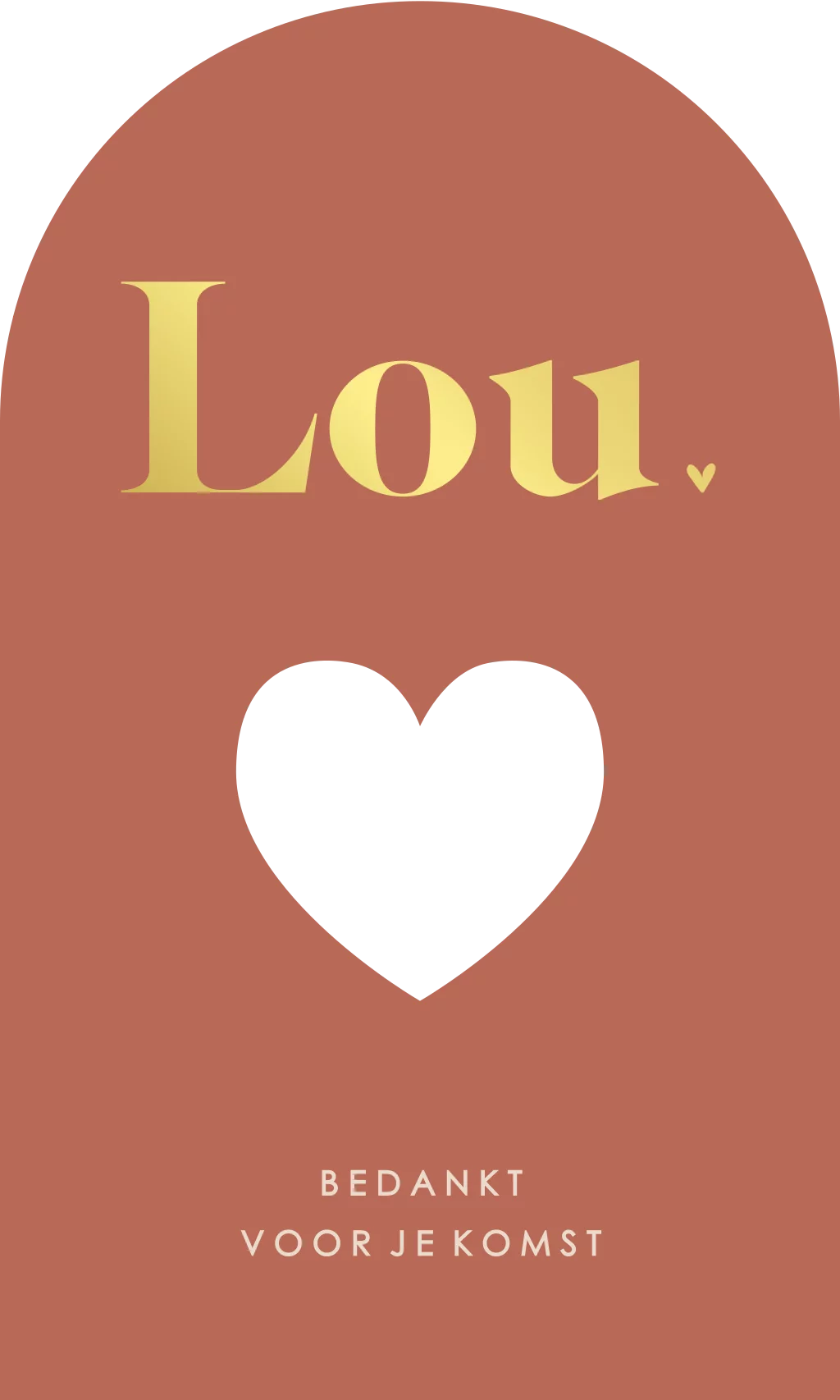 Dit boogkaartje is een toffe geboorte traktatie. Bedank vrienden en familie in de stijl van je geboortekaartje voor alle warme wensen en attenties. In het doorkijkje past een doopsuiker. Het boogkaartje is 6 cm breed en 20 cm lang. De kaartjes hebben een koperkleurige achtergrond en goudfolie voor een luxe uitstraling. Pas het ontwerp gemakkelijk aan in onze online editor.