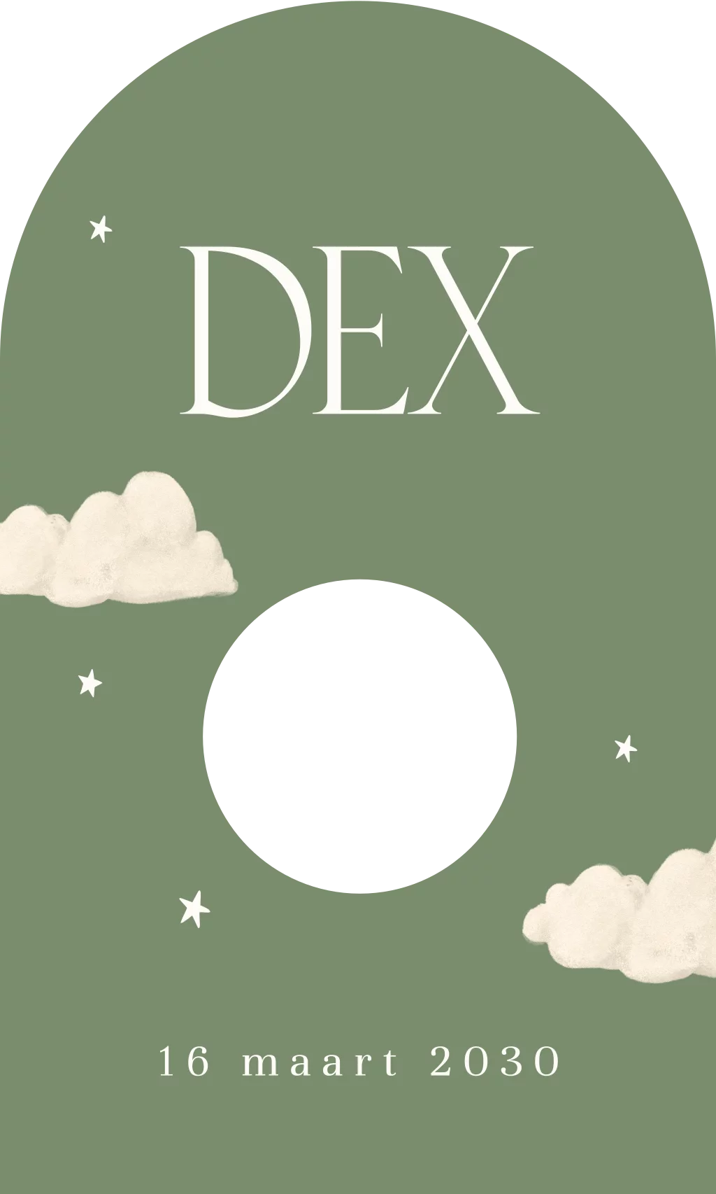 Dit boogkaartje is een toffe geboorte traktatie. Bedank vrienden en familie in de stijl van je geboortekaartje voor alle warme wensen en attenties. De kaartjes hebben een groene achtergrond. Daarnaast zie je de naam met wolkjes en sterretjes. Pas het ontwerp gemakkelijk aan in onze online editor. In het doorkijkje past een doopsuiker. Het boogkaartje is 6 cm breed en 20 cm lang.