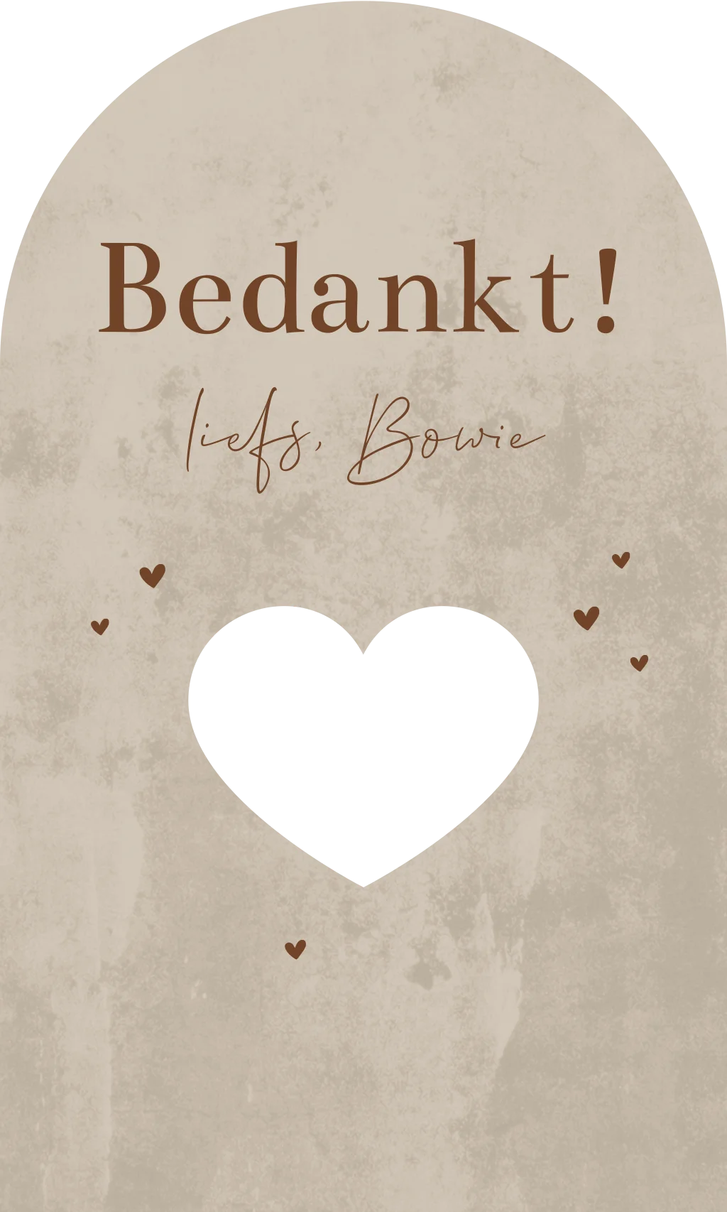 Dit boogkaartje is een lieve geboorte traktatie. Bedank vrienden en familie in de stijl van je geboortekaartje voor alle warme wensen en attenties. Pas het ontwerp gemakkelijk aan in onze online editor. In het doorkijkje past een doopsuiker. Het boogkaartje is 6 cm breed en 20 cm lang.