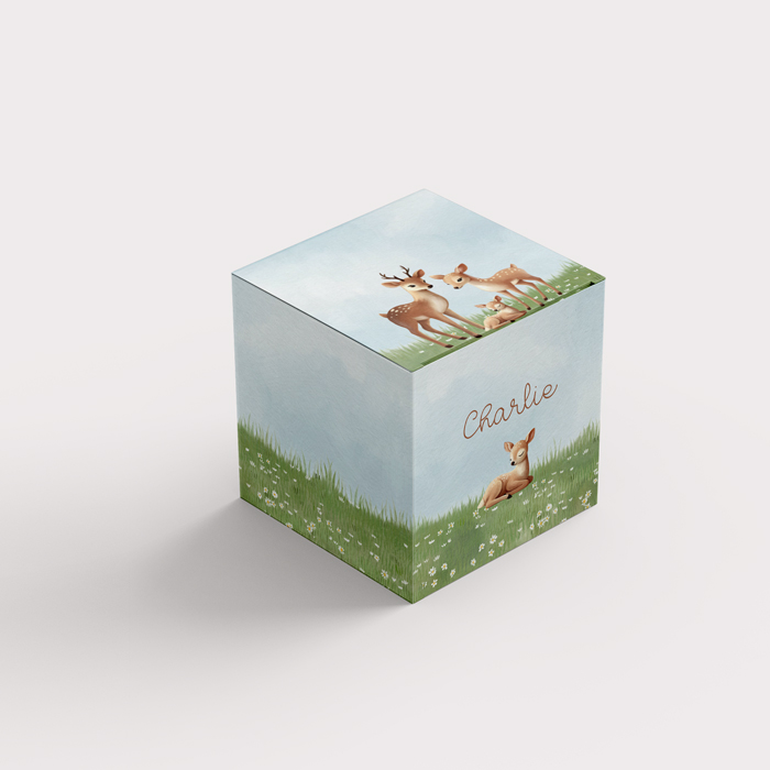Bedank je kraamvisite met dit een lekkere traktatie in dit schattige doopsuikerdoosje met hertengezinnetje in het gras en bloemen. De doopsuikerdoosjes zijn 5 cm hoog en breed en dien je nog zelf in elkaar te zetten.