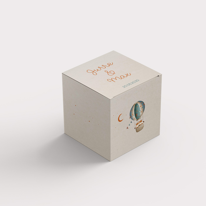 Dit vrolijke doopsuikerdoosje heeft een beige achtergrond met daarop een illustratie van een luchtballon met twee vosjes erin. Dit doosje is de pefecte geboorte traktatie. Bedank vrienden en familie in de stijl van je geboortekaartje voor alle warme wensen en attenties. De doopsuikerdoosjes zijn 5 cm hoog, breed en dien je nog zelf in elkaar te zetten.
