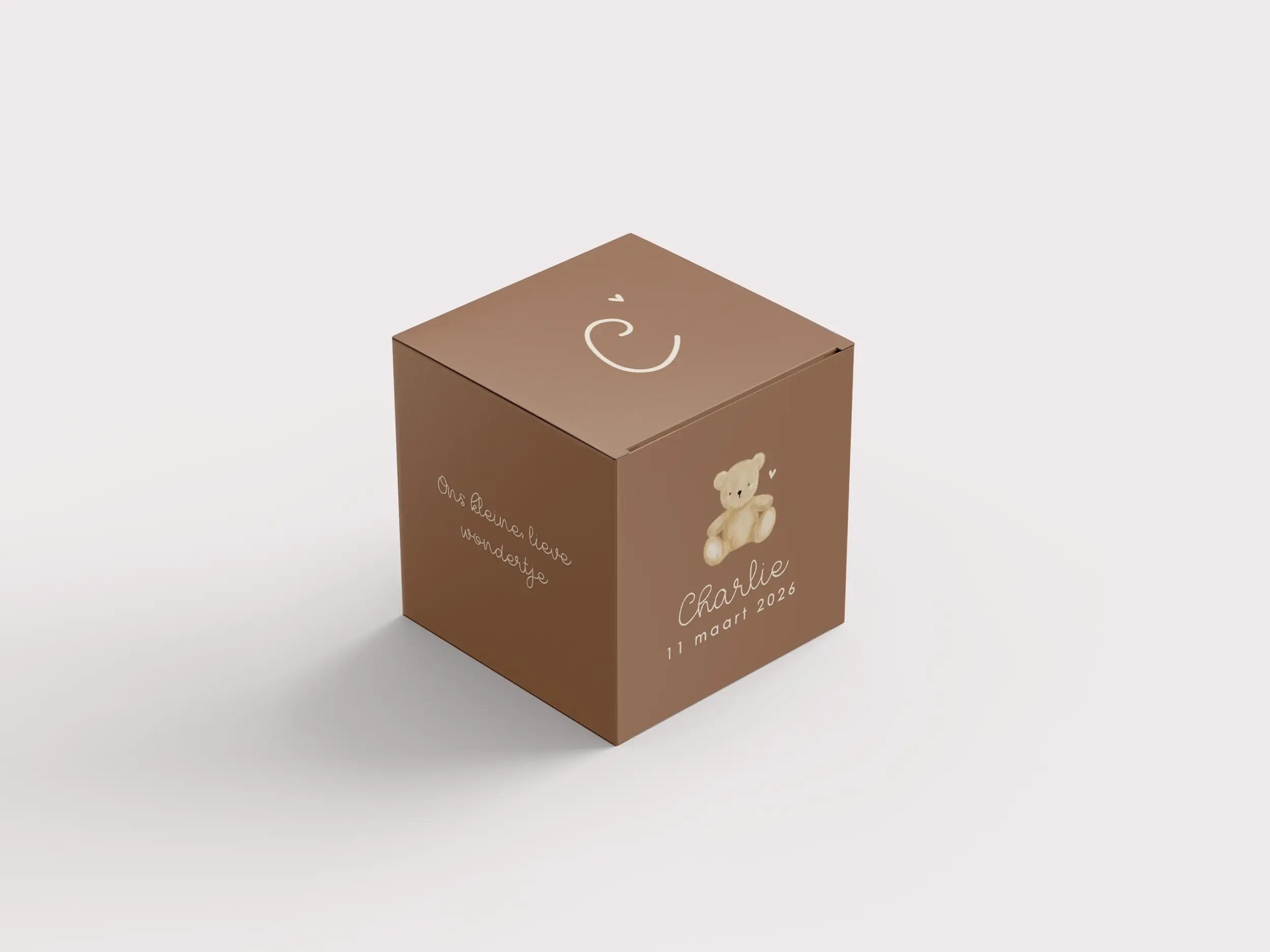Dit schattige doopsuikerdoosje heeft een bruine achtergrond met een illustratie van een lief teddybeertje. Dit doosje is de perfecte geboorte traktatie. Bedank vrienden en familie in de stijl van je geboortekaartje voor alle warme wensen en attenties. De doopsuikerdoosjes zijn er in twee maten en kun je eenvoudig zelf in elkaar zetten.