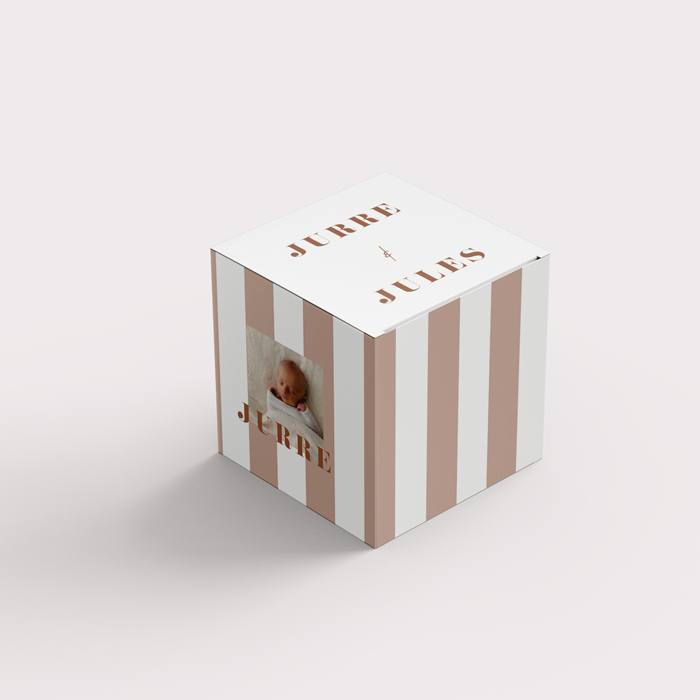 Trakteer je kraamvisite op wat lekkers verpakt in deze onwijs snoezige doopsuikerdoosjes, helemaal in de stijl van het geboortekaartje. De oudroze strepen en foto's zorgen voor een extra persoonlijke touch.