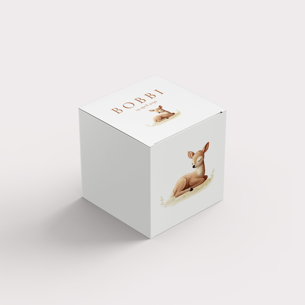Wat een schattig doopsuikerdoosje! Op het doosje zie je een lief hertje. Dit doosje is de pefecte geboorte traktatie. Bedank vrienden en familie in de stijl van je geboortekaartje voor alle warme wensen en attenties. De doopsuikerdoosjes zijn 5 cm hoog, breed en dien je nog zelf in elkaar te zetten.