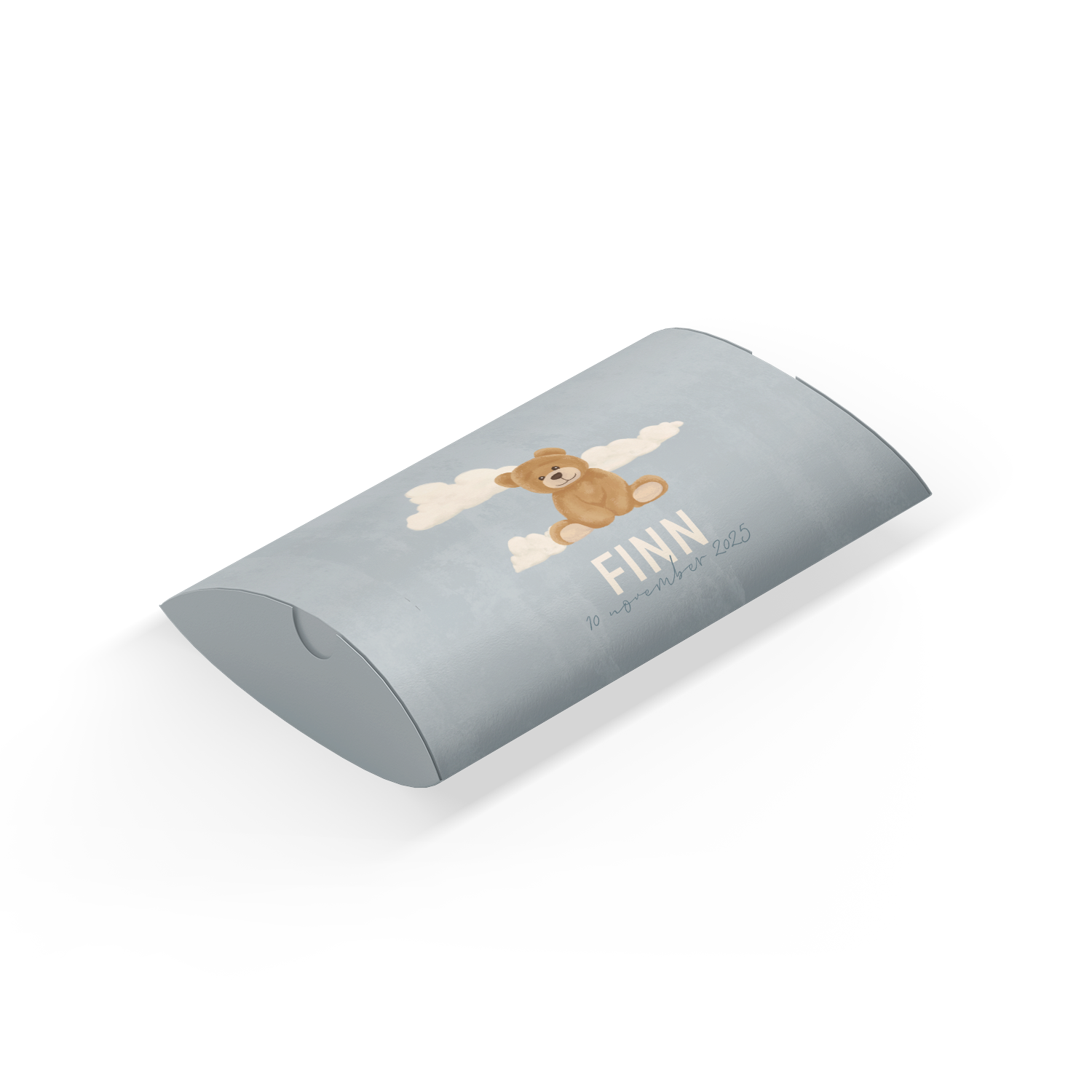 Een lief gondeldoosje als bedankje voor jouw gasten. Het doosje heeft een blauwe achtergrond met daarop een lief beertje en wolkjes. Pas het ontwerp naar wens aan in onze online editor.