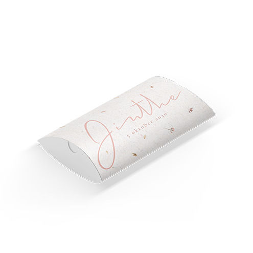 Goed om te weten! - De doosjes worden per 10 stuks geleverd. - De doosjes dienen zelf nog worden vastgeplakt. - Vastplakken kan met tape van 1,2cm breed. - De doosjes worden op een andere manier (en materiaal) geproduceerd dan de geboortekaartjes: de kleuren kunnen dus nét wat anders uitpakken.