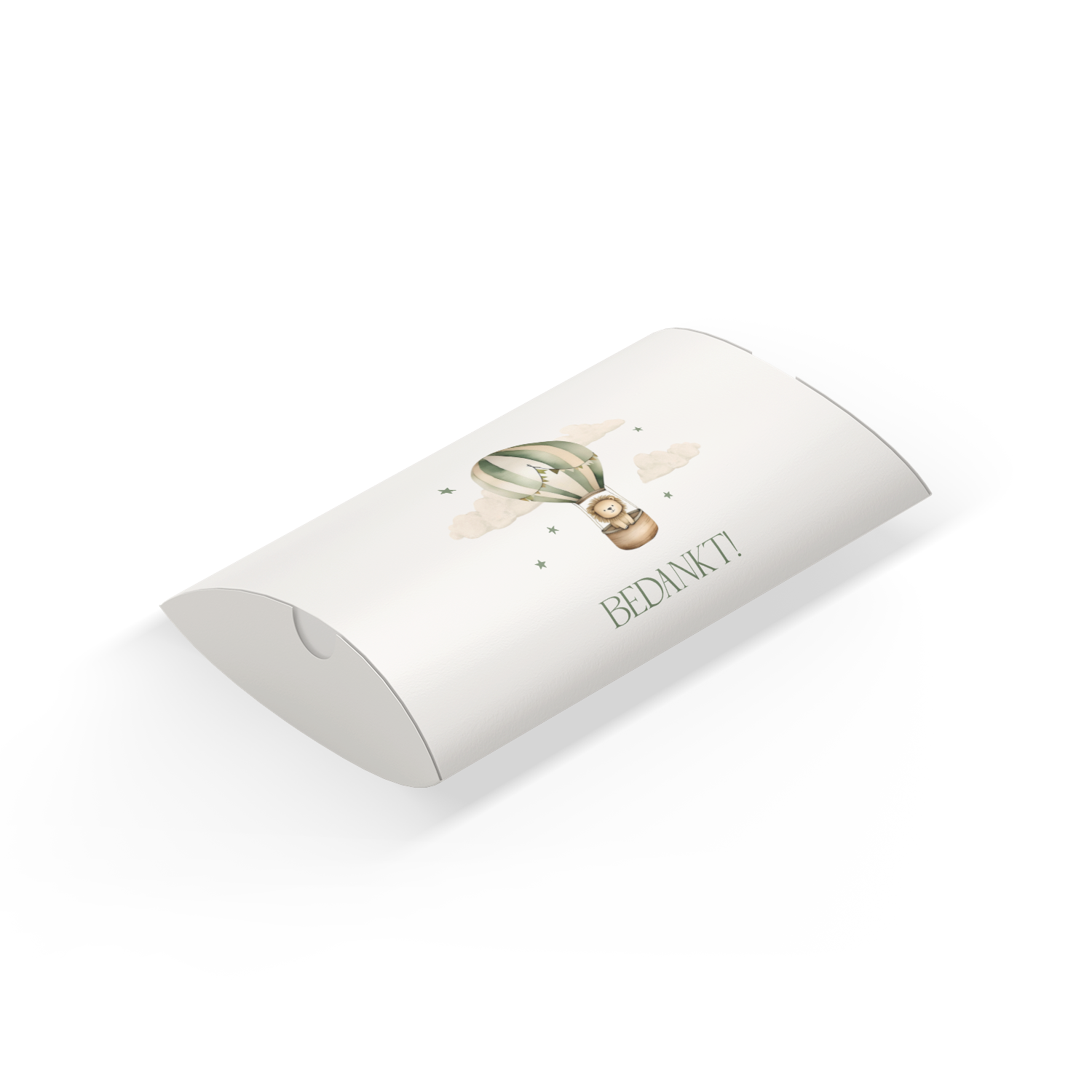Een lief gondeldoosje als bedankje voor jouw gasten. Het doosje heeft een schattige illustratie van een leeuwtje in een luchtballon. Het doosje heeft verschillende groene elementen. Pas het ontwerp naar wens aan in onze online editor.