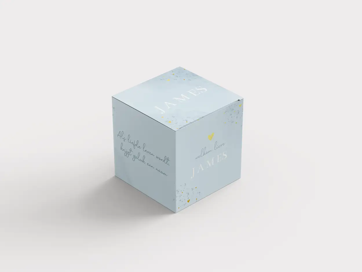 Dit vrolijke doopsuikerdoosje heeft een lichtblauwe watercolor met goudfolie hartjes en details. Dit doosje is de pefecte geboorte traktatie. Bedank vrienden en familie in de stijl van je geboortekaartje voor alle warme wensen en attenties. De doopsuikerdoosjes zijn 5 cm hoog, breed en dien je nog zelf in elkaar te zetten.