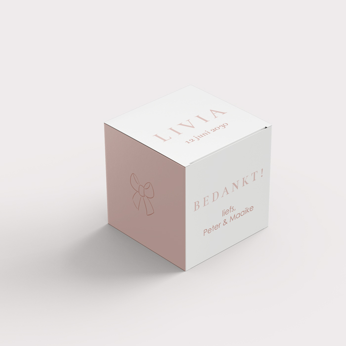 Dit schattige doopsuikerdoosje heeft een roze en witte achtergrond met een schattig strikje. Dit doosje is de pefecte geboorte traktatie. Bedank vrienden en familie in de stijl van je geboortekaartje voor alle warme wensen en attenties. De doopsuikerdoosjes zijn 5 cm hoog, breed en dien je nog zelf in elkaar te zetten.