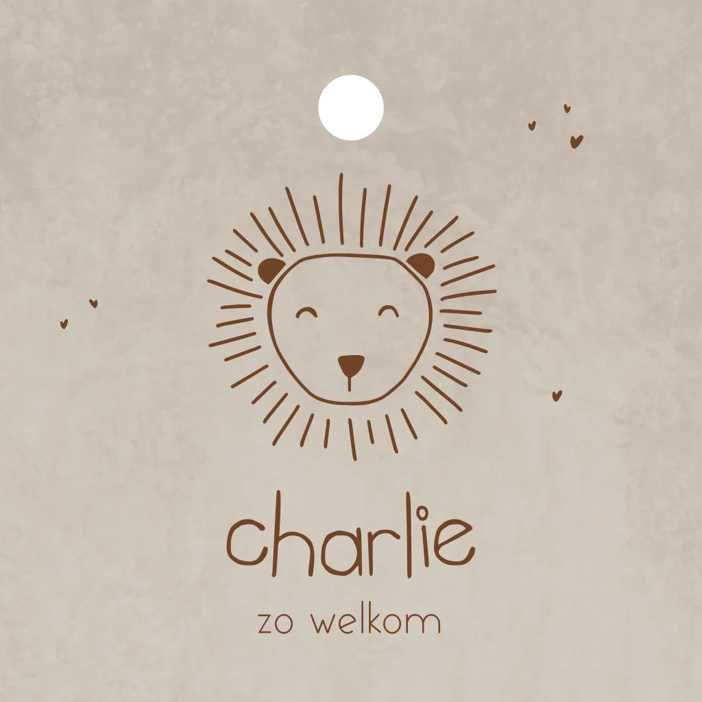 Doopsuiker labeltje in de stijl van het geboortekaartje. Dit labeltje heeft een beige achtergrond met daarop een lieve illustratie van een leeuwtje. Pas het ontwerp naar wens zelf aan.