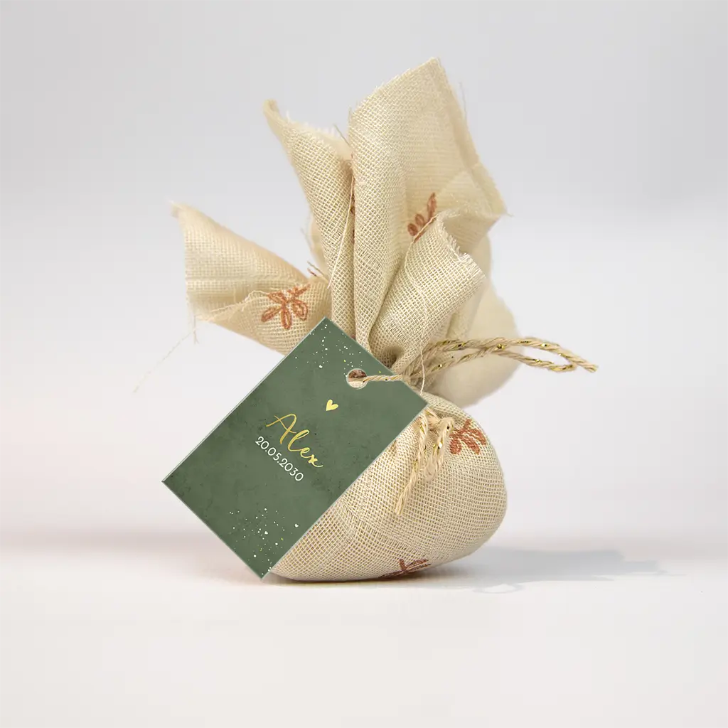 Modern labeltje met goudfolie naam van jullie kindje op een groene velvet-look achtergrond! Pas het labeltje aan in onze editor.