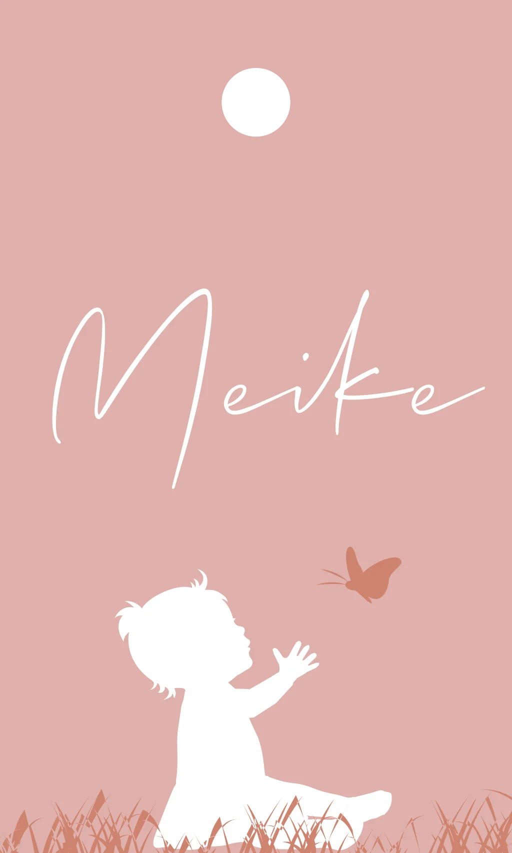 Doopsuiker labeltje in de stijl van het geboortekaartje. Dit labeltje heeft een roze achtergrond met daarop een silhouet van een meisje in het gras en een vlinder. Pas het ontwerp naar wens zelf aan.