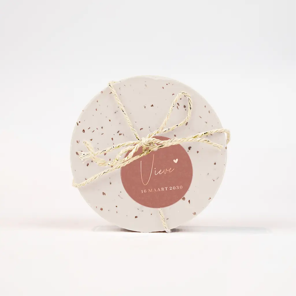 Het label kan je doormiddel van een lief lintje, touwtje, of paperclip bevestigen aan de doopsuiker. Deze kun je hier vinden. Let op: omdat je kunt kiezen uit verschillende bevestigingsmaterialen bestel je het bevestigingsmateriaal van jouw voorkeur los bij het product. Wanneer je de producten thuis krijgt, zet je ze hiermee zelf in elkaar.