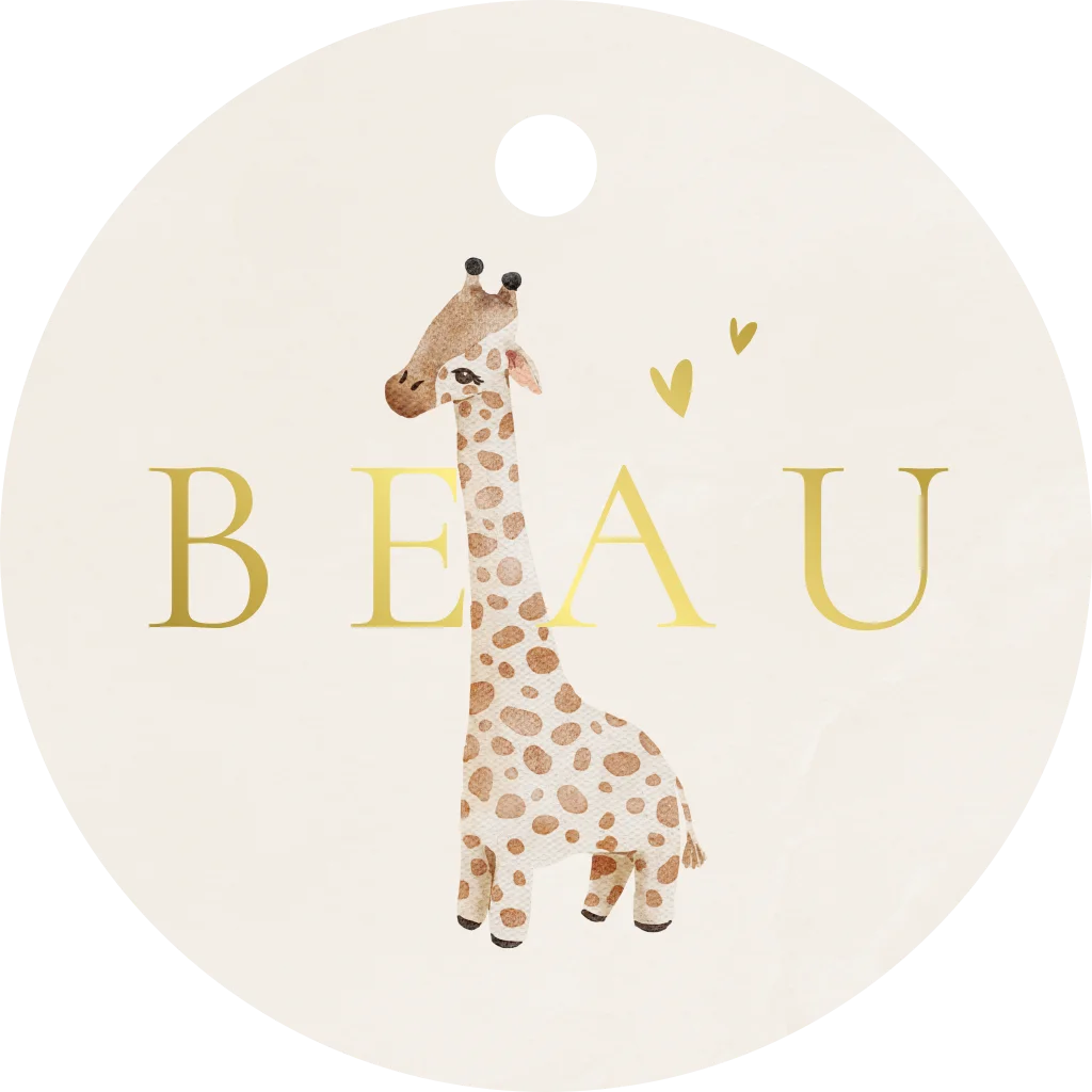 Mooi rond labeltje met een giraf en de naam in goudfolie. De achtergrond van het label is in beige kleur. Pas het labeltje aan in onze editor.
