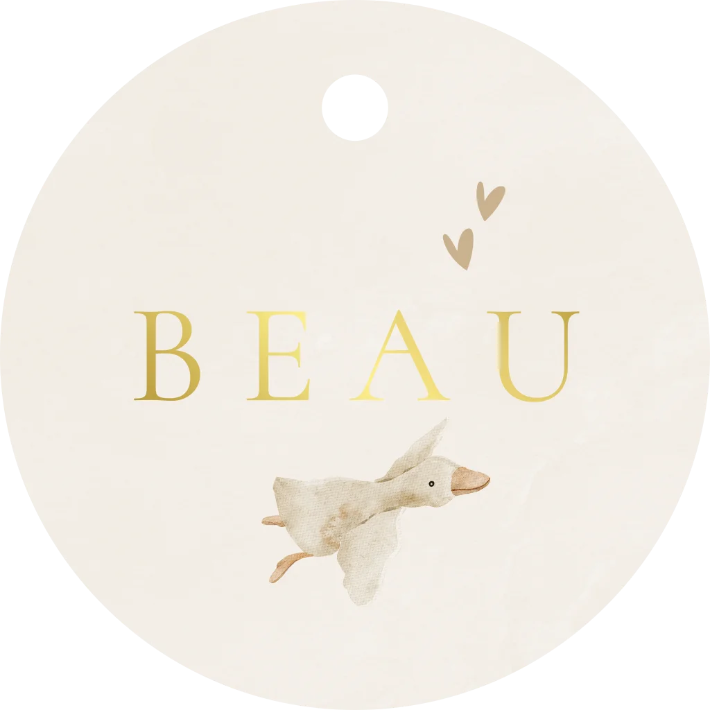 Traktatie labeltje met vogel en naam in folie op beige achtergrond