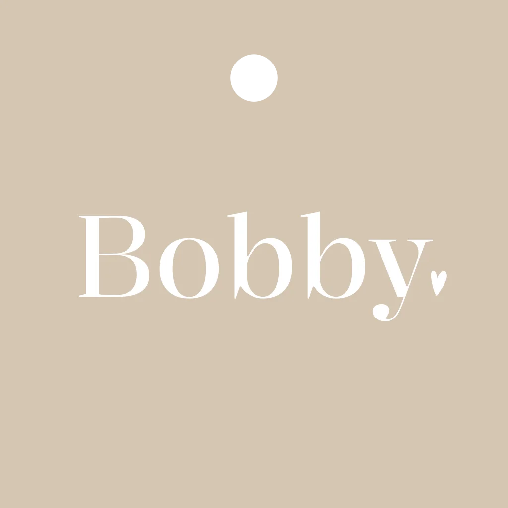 Neutraal label met de naam van jullie kindje op een beige achtergrond. Pas het labeltje eenvoudig aan in onze online editor.
