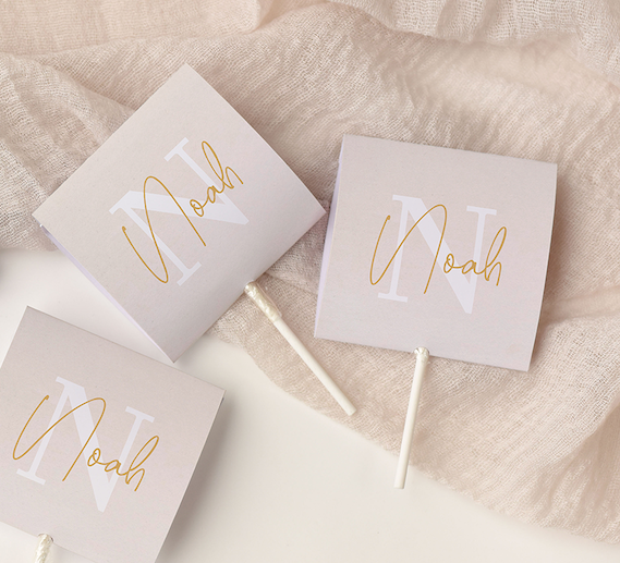 Wat een lieve doopsuiker verpakking! Dit lollyhoesje heeft een beige achtergrond met daar op het initiaal en goudfolie details. Je kunt het hoesje personaliseren en vouwt het thuis gemakkelijk om een lolly heen.