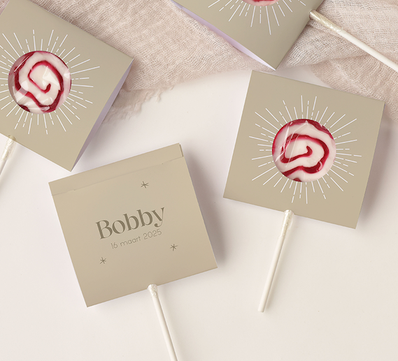 Wat een leuke doopsuiker verpakking! Dit lollyhoesje heeft een groene zachte achtergrond met daarop een zonnetje. Je kunt het hoesje personaliseren en vouwt het thuis gemakkelijk om een lolly heen.
