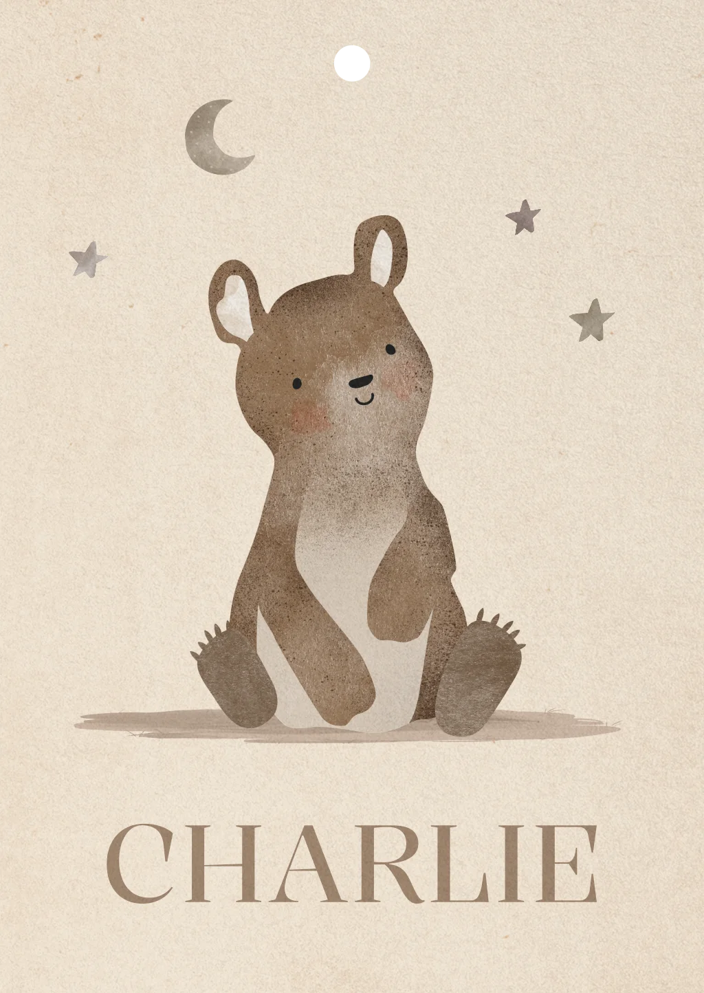 Lief doopsuiker vouwkaartje met beertje, sterren en maan en naam. Leuk als babyborrelbedankjes of traktaties. Bewerk eenvoudig in onze editor.