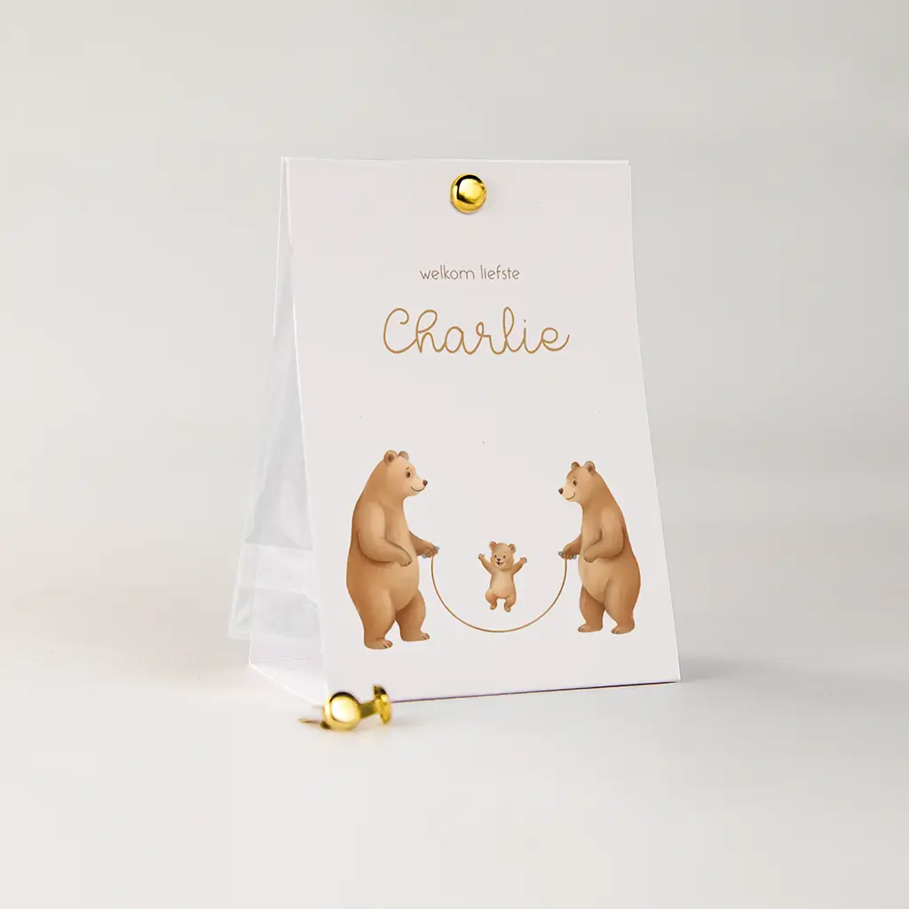 Op dit geboortebedankje staat een vrolijke berenfamilie die samen touwtje springt. Pas het doopsuiker snoepzakje naar wens aan in onze online editor. Personaliseer de buitenzijde van het snoepzakje en bestel meteen de zakjes en splitpen mee, om de doopsuikers compleet te maken. Je hoeft enkel de snoepjes nog zelf uit te zoeken en het geheel in elkaar te zetten. Heerlijk klusje tijdens je verlof!
