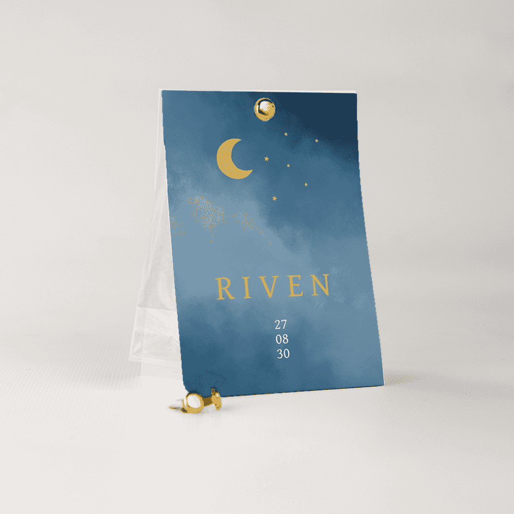 Een stijlvol doopsuiker snoepzakje. Het snoepzakje heeft een blauwe achtergrond met een goudfolie maan. Pas het doopsuiker snoepzakje naar wens aan in onze online editor.