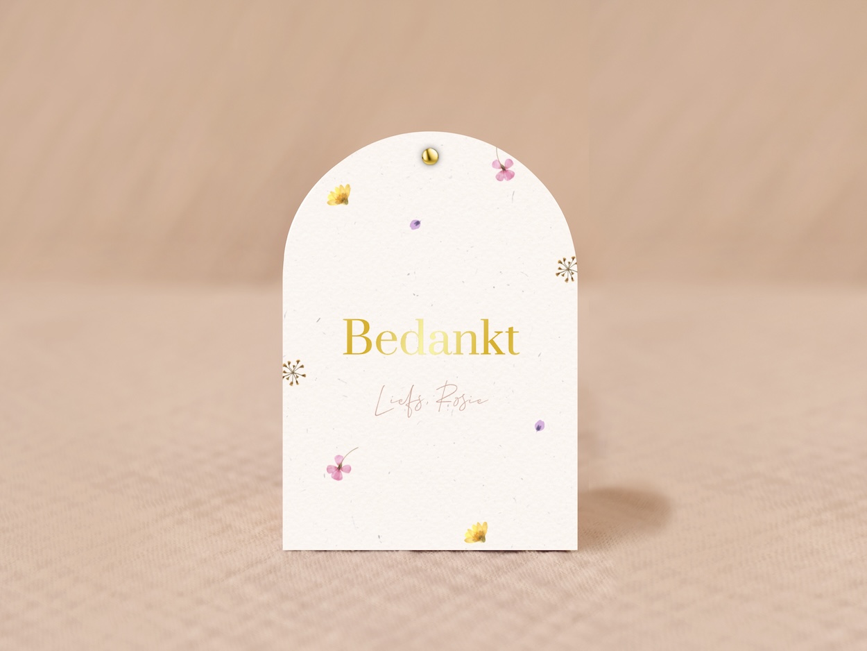Dit doopsuiker snoepzakje met gedroogde bloemen en goudfolie tekst is het perfecte geboortebedankje. Personaliseer de buitenzijde van het snoepzakje en bestel meteen de zakjes en splitpen mee, om de doopsuikers compleet te maken.