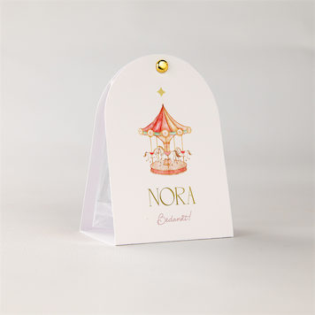 Een doopsuiker snoepzakje bijpassend bij het geboortekaartje. Het snoepzakje heeft een illustratie van een carrousel met paardjes. Het zakje heeft zachte roze en rode tinten. Dit doopsuiker snoepzakje is perfect als geboortebedankje voor de geboorte van jouw kindje. Bestel meteen de zakjes en splitpen mee, om de doopsuikers compleet te maken. Je hoeft enkel de snoepjes nog zelf uit te zoeken en het geheel in elkaar te zetten. Heerlijk klusje tijdens je verlof!