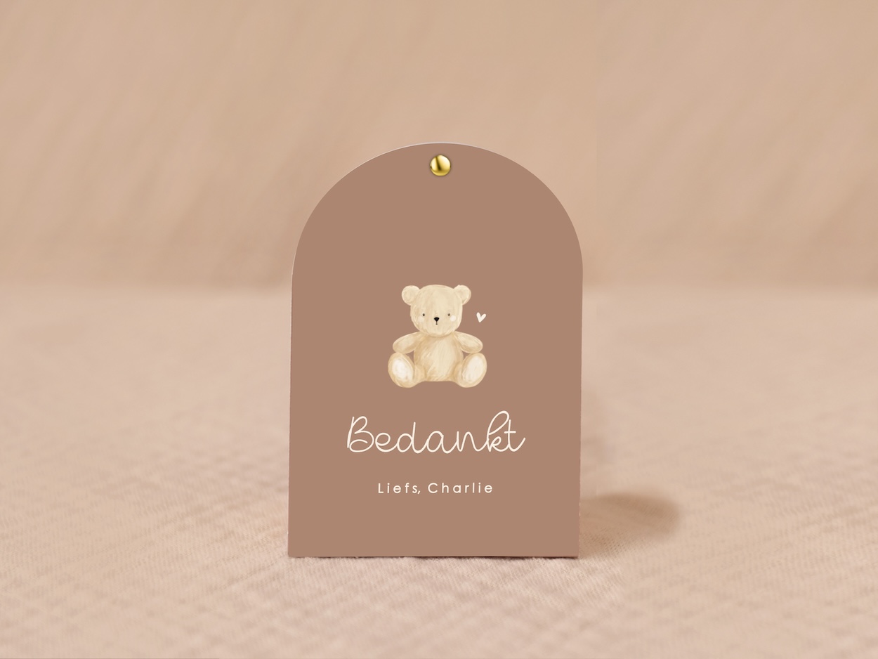 Op zoek naar een geboortebedankje? Ga voor dit schattige doopsuiker snoepzakje met illustratie van een teddybeertje. Pas het snoepzakje naar wens aan in onze in de online editor.
