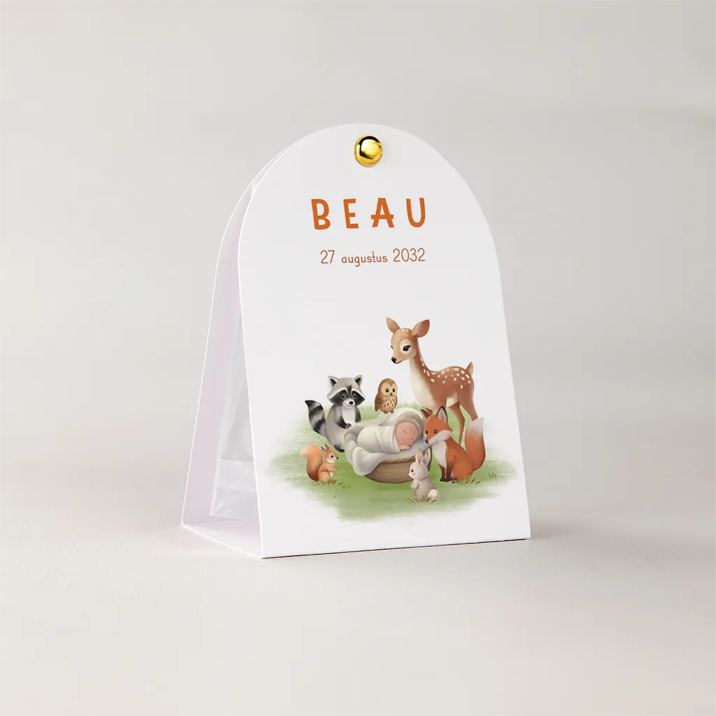 Dit doopsuiker snoepzakje met illustratie van een baby in een mandje omringd door bosdieren is perfect als geboortebedankje voor de geboorte van jouw kindje. Personaliseer de buitenzijde van het snoepzakje en bestel meteen de zakjes en splitpen mee, om de doopsuikers compleet te maken. Je hoeft enkel de snoepjes nog zelf uit te zoeken en het geheel in elkaar te zetten. Heerlijk klusje tijdens je verlof!