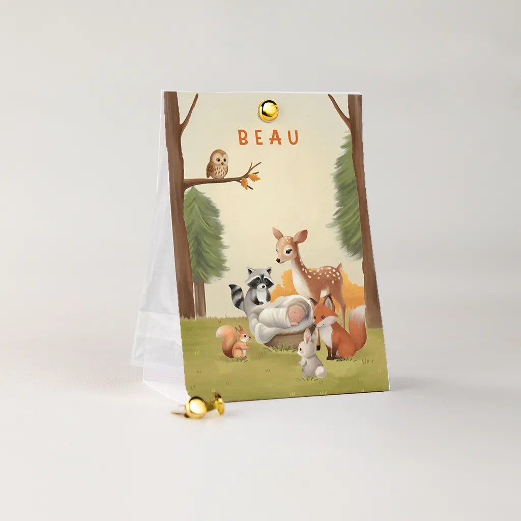 Dit doopsuiker snoepzakje met herfstlucht en schattige bosdieren is perfect als geboortebedankje voor de geboorte van jouw kindje. Personaliseer de buitenzijde van het snoepzakje en bestel meteen de zakjes en splitpen mee, om de doopsuikers compleet te maken. Je hoeft enkel de snoepjes nog zelf uit te zoeken en het geheel in elkaar te zetten. Heerlijk klusje tijdens je verlof!