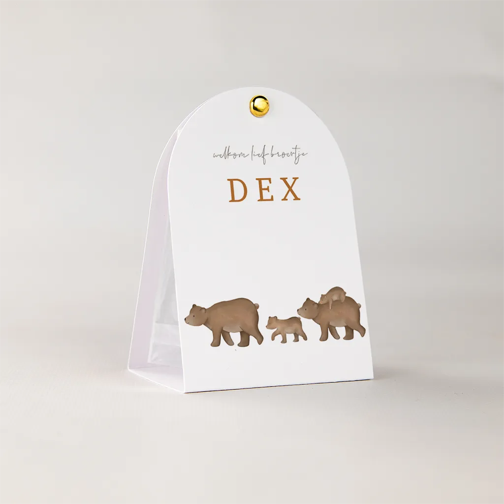 Dit doopsuiker snoepzakje met witte achtergrond en een berengezin is perfect als geboortebedankje voor de geboorte van jouw kindje. Personaliseer de buitenzijde van het snoepzakje en bestel meteen de zakjes en splitpen mee, om de doopsuikers compleet te maken. Je hoeft enkel de snoepjes nog zelf uit te zoeken en het geheel in elkaar te zetten. Heerlijk klusje tijdens je verlof!