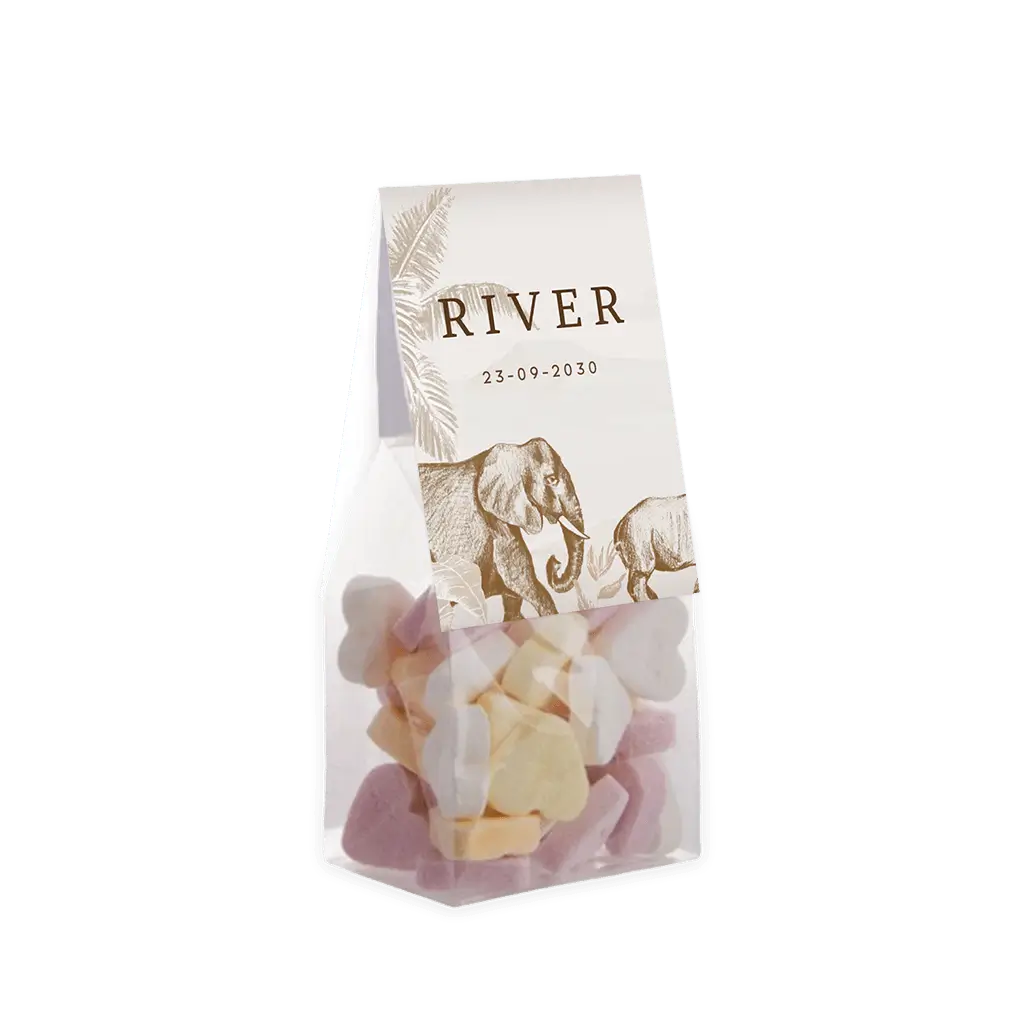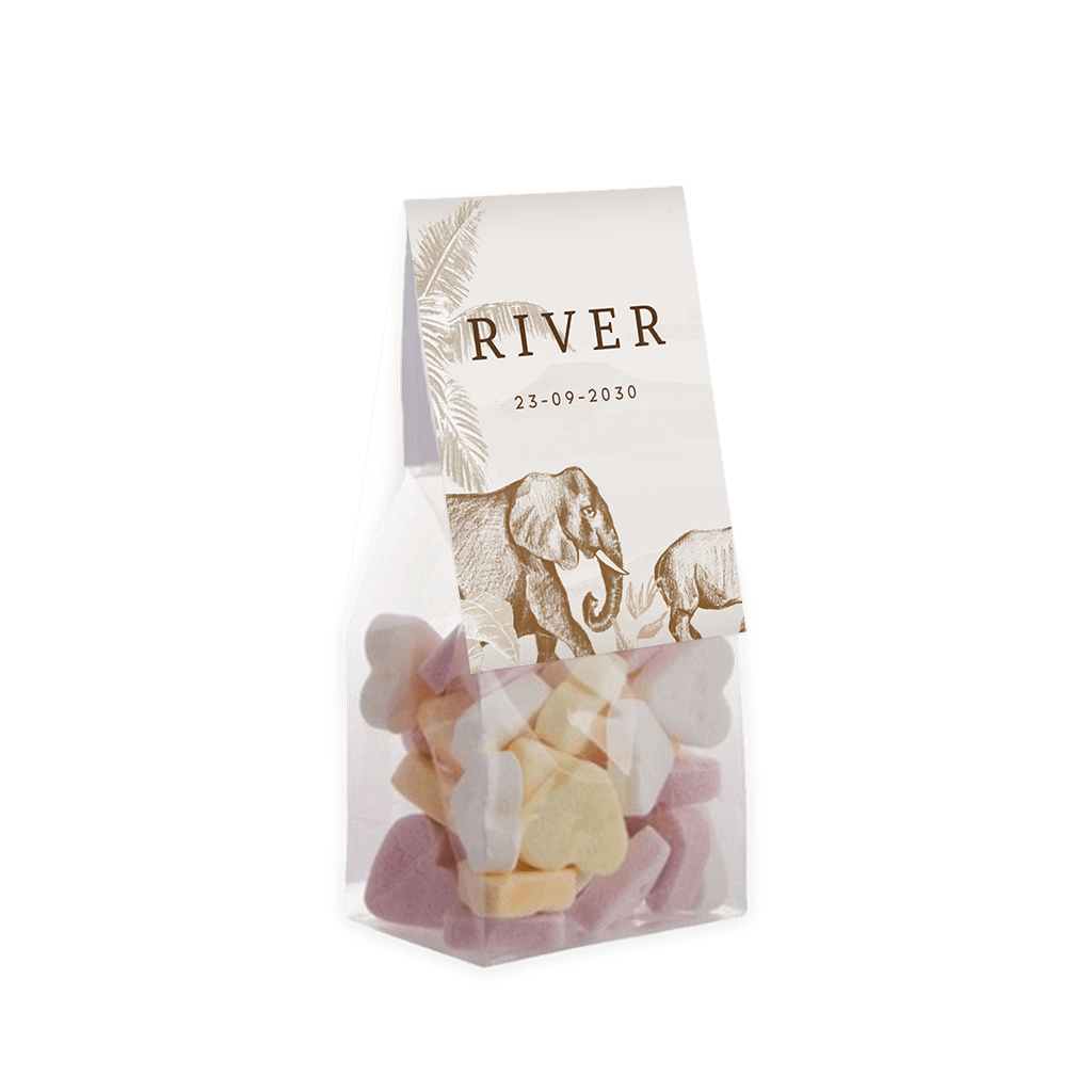 Dit vouwkaartje is een schattige geboorte traktatie. Bedank vrienden en familie in de stijl van je geboortekaartje voor alle warme wensen en attenties. Het kaartje heeft beige tinten met prachtige illustraties met jungledieren. Het vouwkaartje is 6 cm breed en 17 cm lang. Bestel meteen de zakjes mee, om de doopsuikers compleet te maken. Je hoeft enkel de snoepjes nog zelf uit te zoeken en het geheel in elkaar te zetten. Heerlijk klusje tijdens je verlof!