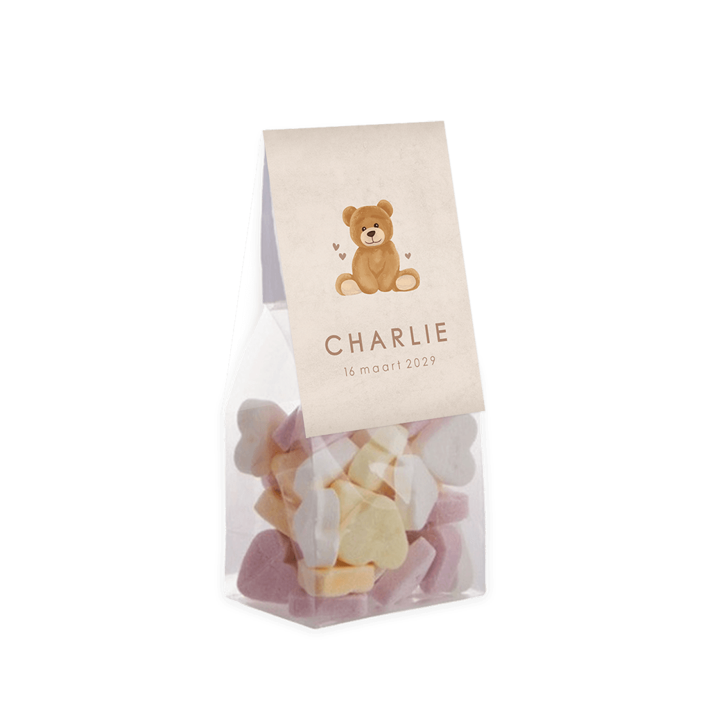 Dit vouwkaartje is een toffe geboorte traktatie. Bedank vrienden en familie in de stijl van je geboortekaartje voor alle warme wensen en attenties. Centraal op het kaartje staat een lieve illustratie van een teddybeer met daaronder de naam van jullie kleintje. Het vouwkaartje is 6 cm breed en 17 cm lang. Bestel meteen de zakjes mee, om de doopsuikers compleet te maken. Je hoeft enkel de snoepjes nog zelf uit te zoeken en het geheel in elkaar te zetten. Heerlijk klusje tijdens je verlof!