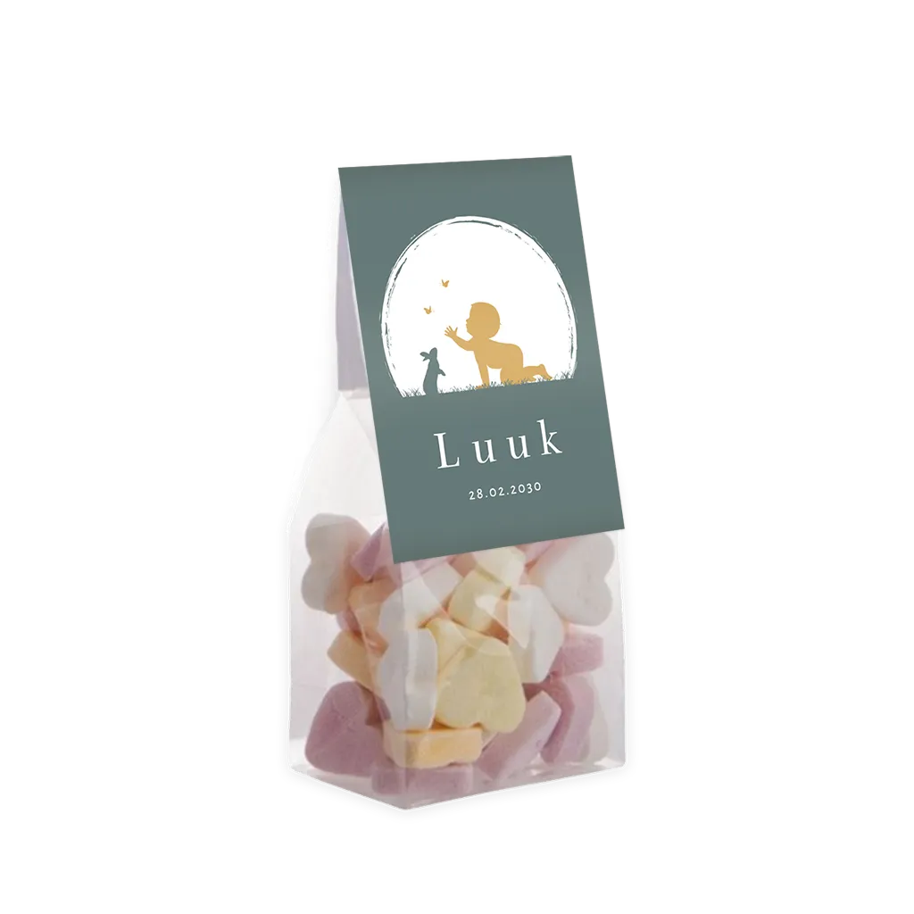 Dit vouwkaartje is een schattige geboorte traktatie. Bedank vrienden en familie in de stijl van je geboortekaartje voor alle warme wensen en attenties. Centraal op het kaartje staat een silhouet van een jongentje met de naam van jullie kleine. Het vouwkaartje is 6 cm breed en 17 cm lang. Bestel meteen de zakjes mee, om de doopsuikers compleet te maken. Je hoeft enkel de snoepjes nog zelf uit te zoeken en het geheel in elkaar te zetten. Heerlijk klusje tijdens je verlof!