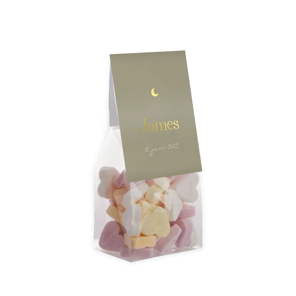 Dit vouwkaartje is een schattige geboorte traktatie. Bedank vrienden en familie in de stijl van je geboortekaartje voor alle warme wensen en attenties. Het kaartje heeft een mooie groene kleur met daarop de naam en een klein maantje die gedrukt worden in goudfolie. Het vouwkaartje is 6 cm breed en 17 cm lang. Bestel meteen de zakjes mee, om de doopsuikers compleet te maken. Je hoeft enkel de snoepjes nog zelf uit te zoeken en het geheel in elkaar te zetten. Heerlijk klusje tijdens je verlof!