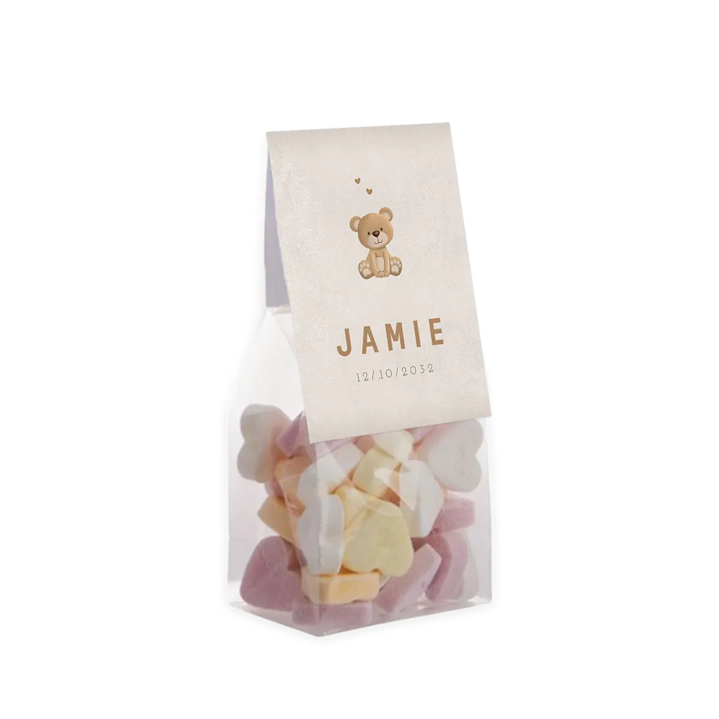 Dit vouwkaartje is een schattige geboorte traktatie. Bedank vrienden en familie in de stijl van je geboortekaartje voor alle warme wensen en attenties. Op het lichtbruine kaartje staat een illustratie van een lief beertje met kleine hartjes. Het vouwkaartje is 6 cm breed en 17 cm lang. Bestel meteen de zakjes mee, om de doopsuikers compleet te maken. Je hoeft enkel de snoepjes nog zelf uit te zoeken en het geheel in elkaar te zetten. Heerlijk klusje tijdens je verlof!