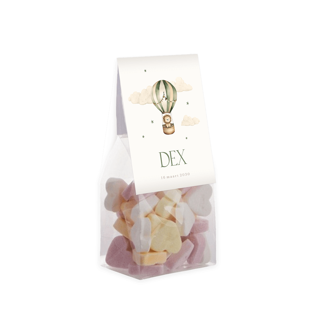 Een lief doopsuiker vouwkaartje passend bij het geboortekaartje. Het kaartje heeft een luchtballon met een leeuwtje, wolkjes en sterretjes. Pas het ontwerp naar wens zelf aan. Het vouwkaartje is 6 cm breed en 17 cm lang. Bestel meteen de zakjes mee, om de doopsuikers compleet te maken. Je hoeft enkel de snoepjes nog zelf uit te zoeken en het geheel in elkaar te zetten. Heerlijk klusje tijdens je verlof!