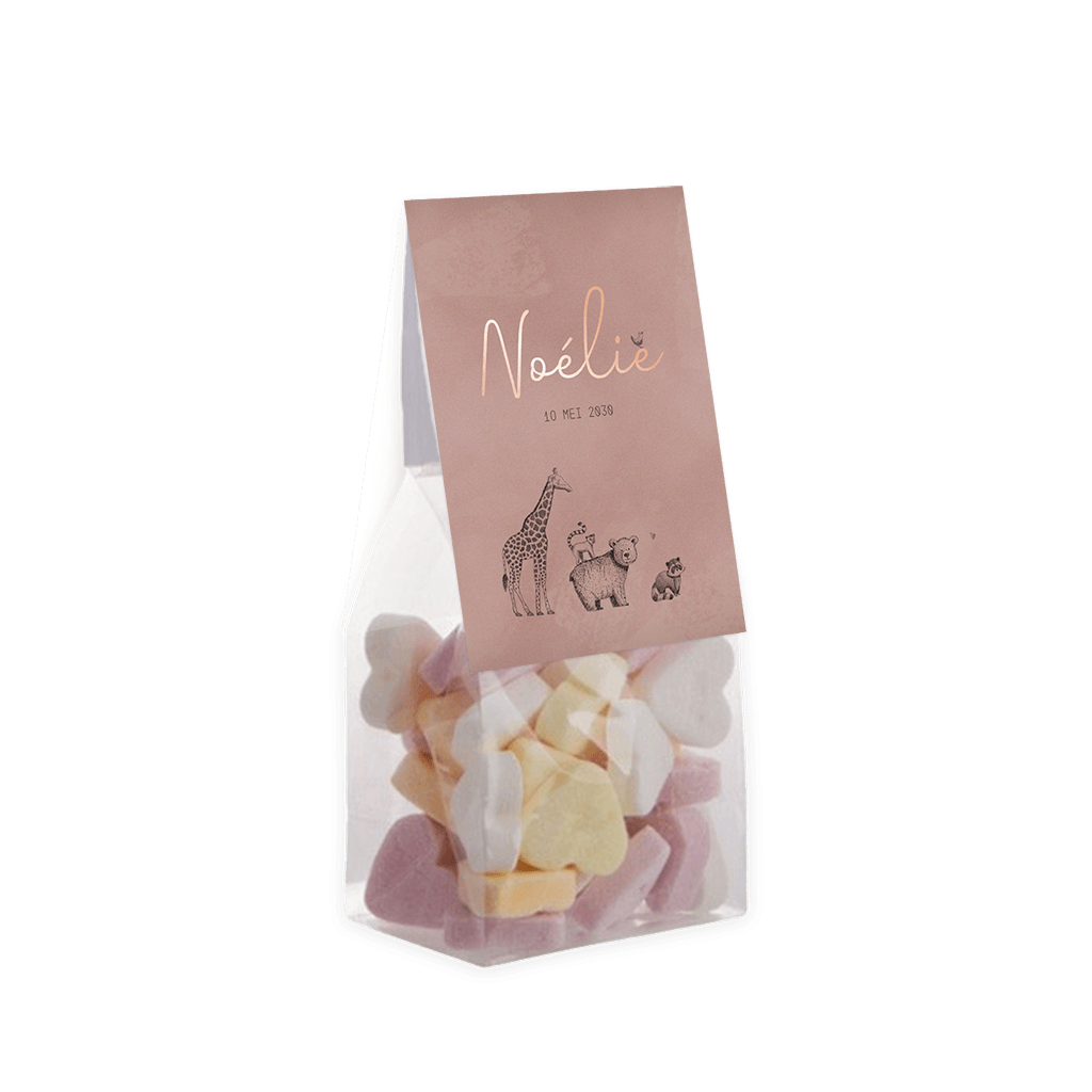Dit vouwkaartje is een schattige geboorte traktatie. Bedank vrienden en familie in de stijl van je geboortekaartje voor alle warme wensen en attenties. Het vouwkaartje is 6 cm breed en 17 cm lang. Bestel meteen de zakjes mee, om de doopsuikers compleet te maken. Je hoeft enkel de snoepjes nog zelf uit te zoeken en het geheel in elkaar te zetten. Heerlijk klusje tijdens je verlof!