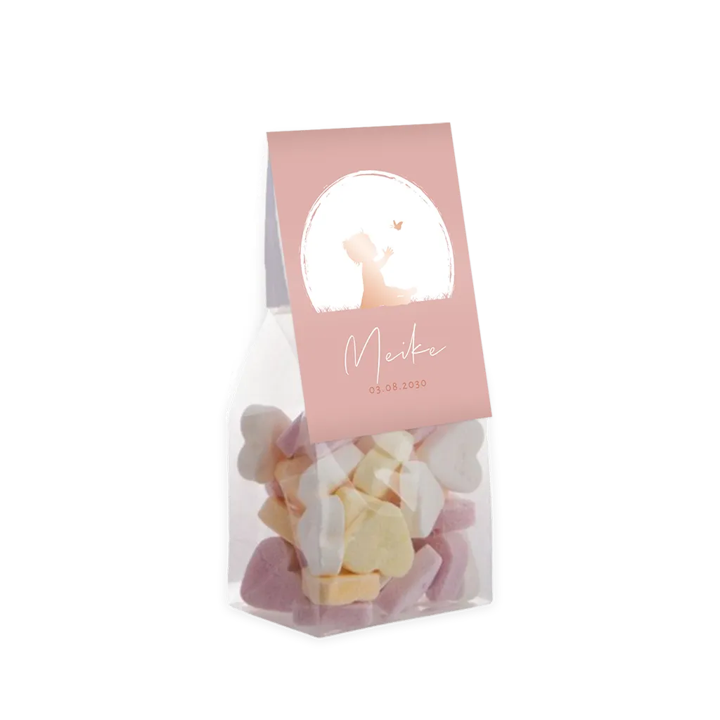 Dit vouwkaartje is een schattige geboorte traktatie. Bedank vrienden en familie in de stijl van je geboortekaartje voor alle warme wensen en attenties. Centraal op het roze kaartje staat een silhouet van een meisje en de naam van jullie dochter. Het vouwkaartje is 6 cm breed en 17 cm lang. Bestel meteen de zakjes mee, om de doopsuikers compleet te maken. Je hoeft enkel de snoepjes nog zelf uit te zoeken en het geheel in elkaar te zetten. Heerlijk klusje tijdens je verlof!
