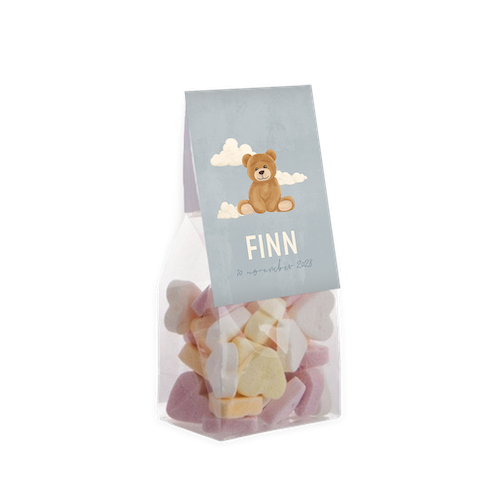 Dit vouwkaartje is een toffe geboorte traktatie. Bedank vrienden en familie in de stijl van je geboortekaartje voor alle warme wensen en attenties. Het kaartje heeft een blauwe achtergrond met daarop een teddybeer tussen de wolken. Het vouwkaartje is 6 cm breed en 17 cm lang. Bestel meteen de zakjes mee, om de doopsuikers compleet te maken. Je hoeft enkel de snoepjes nog zelf uit te zoeken en het geheel in elkaar te zetten. Heerlijk klusje tijdens je verlof!
