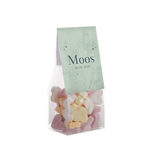 Dit vouwkaartje is een toffe geboorte traktatie. Bedank vrienden en familie in de stijl van je geboortekaartje voor alle warme wensen en attenties. Het vouwkaartje is 6 cm breed en 17 cm lang. Het kaartje heeft een velvet look achtergrond in groen met daarop kleine hartjes in donkergroen. Pas het ontwerp naar eigen wens aan in onze online editor. Bestel meteen de zakjes mee, om de doopsuikers compleet te maken. Je hoeft enkel de snoepjes nog zelf uit te zoeken en het geheel in elkaar te zetten. Heerlijk klusje tijdens je verlof!