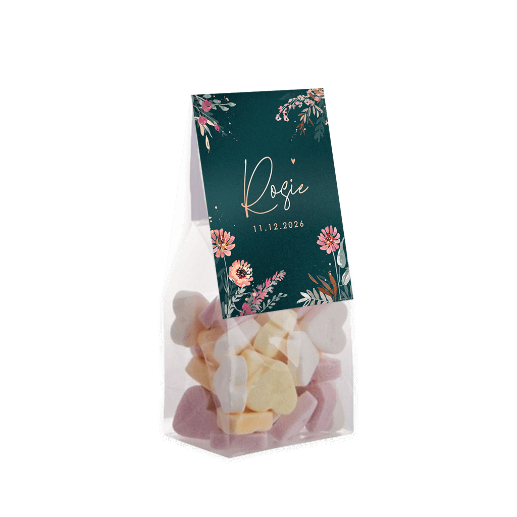 Dit vouwkaartje is een toffe geboorte traktatie. Bedank vrienden en familie in de stijl van je geboortekaartje voor alle warme wensen en attenties. Het kaartje heeft een donkergroene achtergrond met kleurrijke bloemen. Het vouwkaartje is 6 cm breed en 17 cm lang. Bestel meteen de zakjes mee, om de doopsuikers compleet te maken. Je hoeft enkel de snoepjes nog zelf uit te zoeken en het geheel in elkaar te zetten. Heerlijk klusje tijdens je verlof!