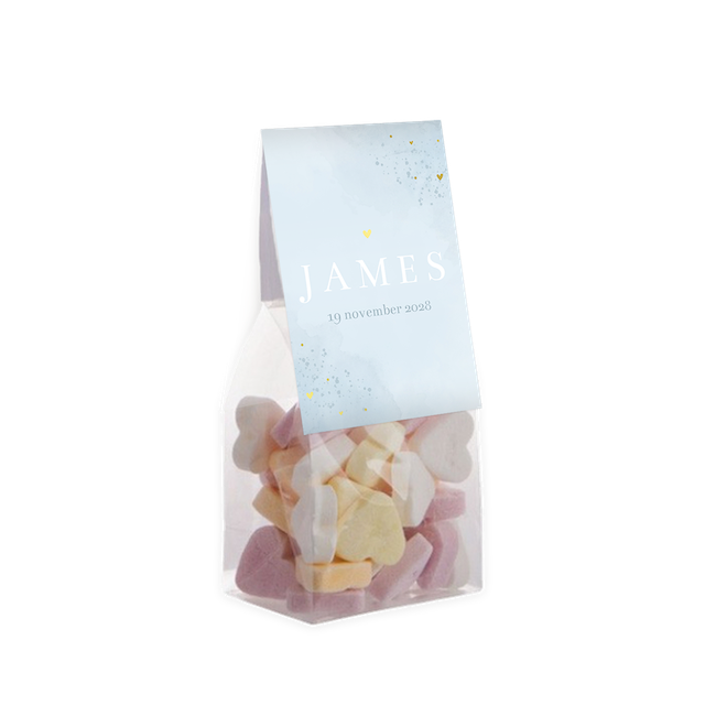 Dit vouwkaartje is een toffe geboorte traktatie. Bedank vrienden en familie in de stijl van je geboortekaartje voor alle warme wensen en attenties. Het kaartje heeft een lichte watercolour achtergrond met goudfolie elementen voor een luxe uitstraling. Het vouwkaartje is 6 cm breed en 17 cm lang. Bestel meteen de zakjes mee, om de doopsuikers compleet te maken. Je hoeft enkel de snoepjes nog zelf uit te zoeken en het geheel in elkaar te zetten. Heerlijk klusje tijdens je verlof!